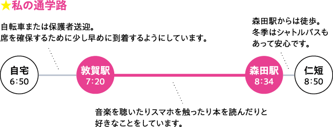 一人暮らしへの憧れもありましたが、親のサポートや経済面を考え、敦賀の実家から電車通学しています。通学定期補助の制度があるおかげで、趣味のライブや旅行を楽しむ余裕を持てるのが大きな魅力です。平日のアルバイトがしづらい面もありますが、その分休日にしっかり楽しんでメリハリのついた学生生活を送っています。地元が大好きなので、実習も就職も敦賀でしたいと思っています!