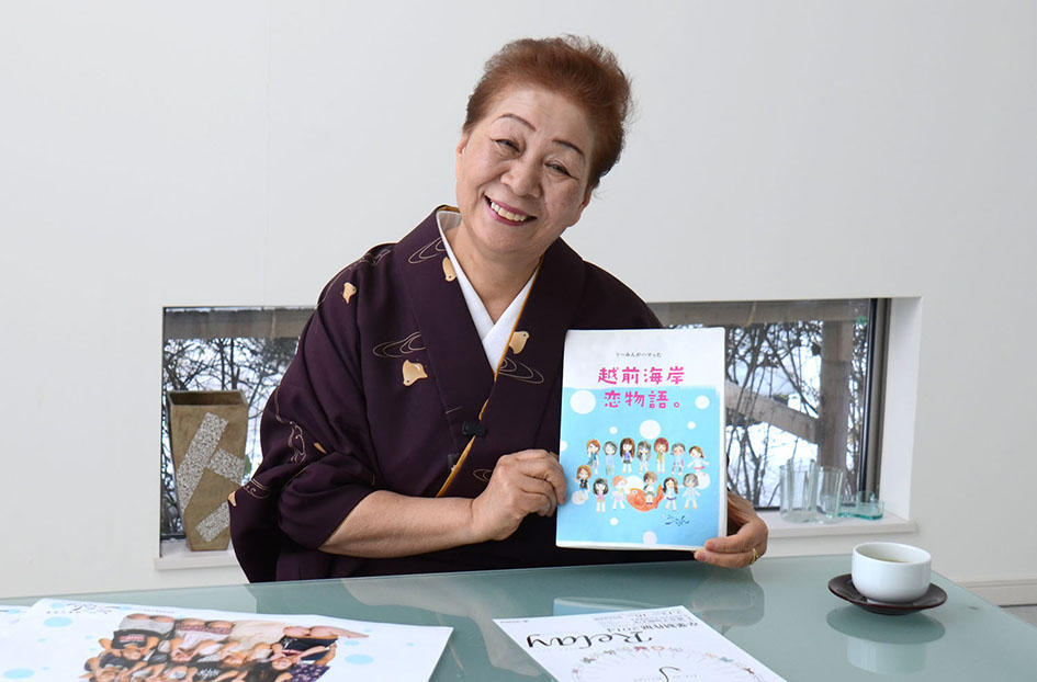 旅館組合長である白浜荘の女将"むきむきみっちゃん"。マップは今後、JR福井駅や旅行会社など各地でPRに使用されます。