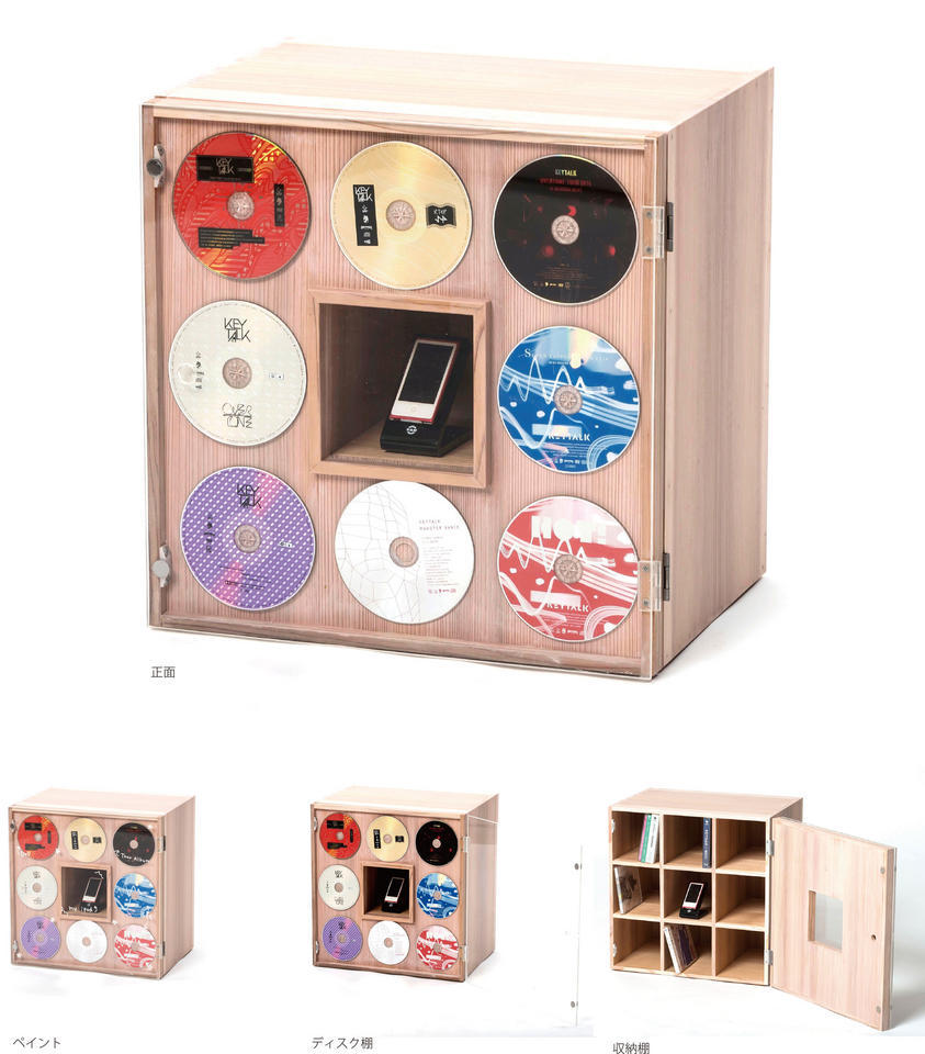 「chocon」 ディスクで魅せる小さな木棚 「ケースではなく、ディスクをメインに」 普段はケースに隠れているCDのディスクには 素敵なデザインが施されています。 それを隠してしまうのではなく、活かしたいと思い、制作しました。 ネットで音楽を買うことも便利ですが、 CDであるからこその良さが伝わることを願っています。
