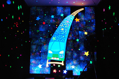この中でも駅ギャラリーを全面使った「もりた銀河鉄道77」は蛍光塗料で描いた銀河鉄道が、