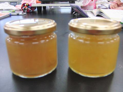 最後に皮つきのりんごジャムと皮なしのりんごジャムの違いを比べると・・・(左 皮つき/右 皮なし)
