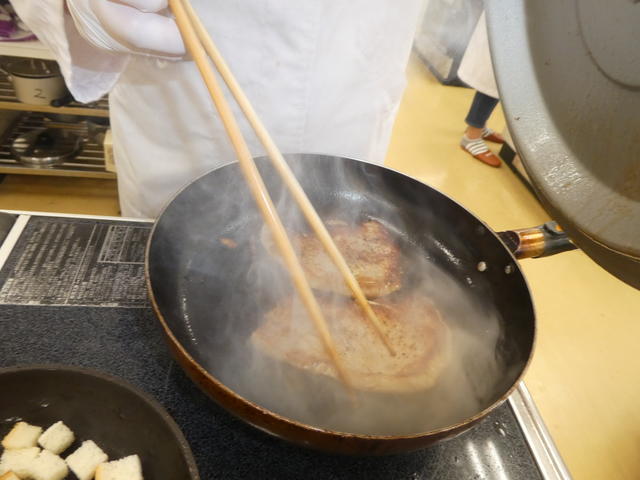 肉厚な豚肉に、ニンニクを挟んでソテーしているところです。