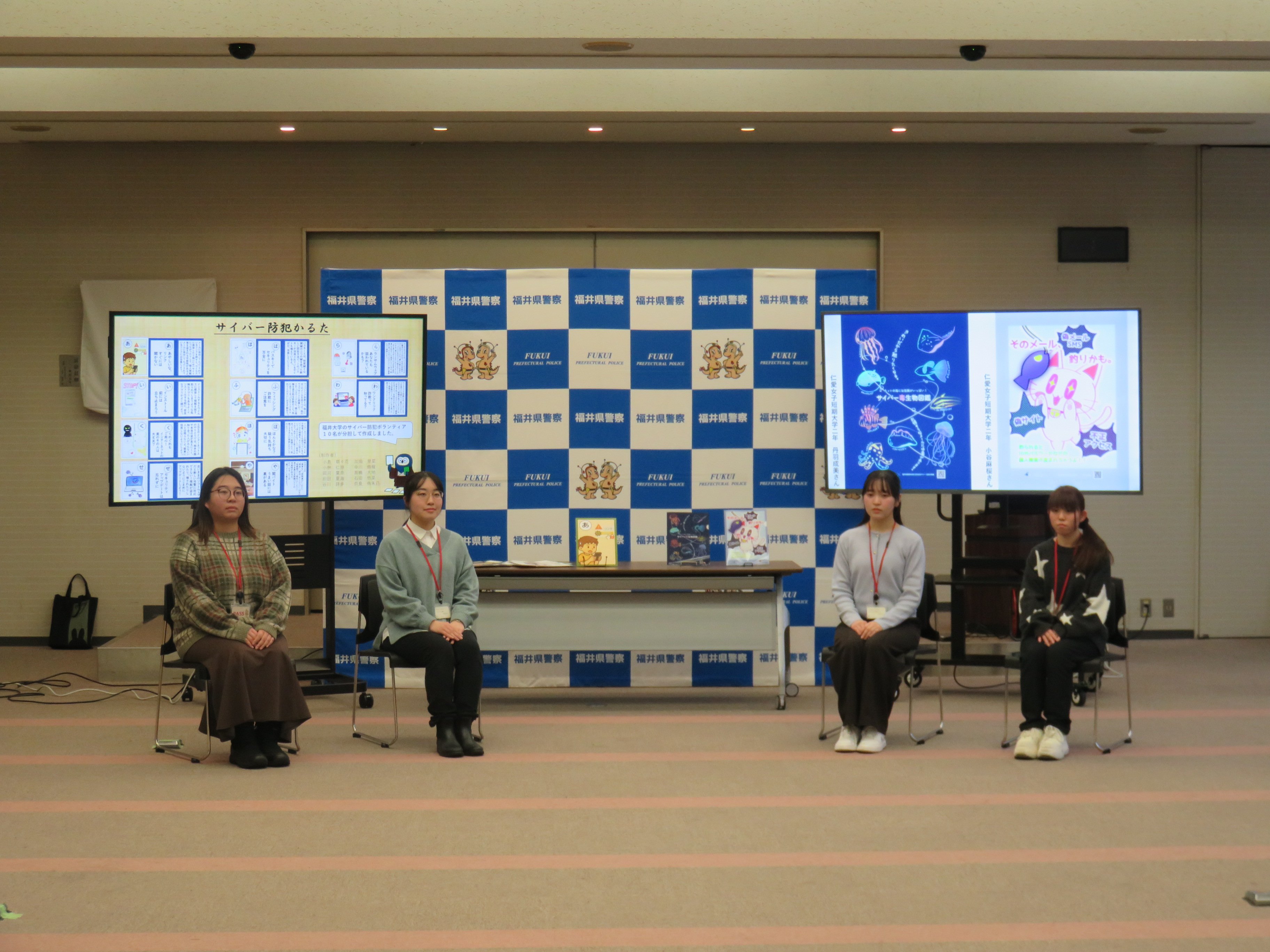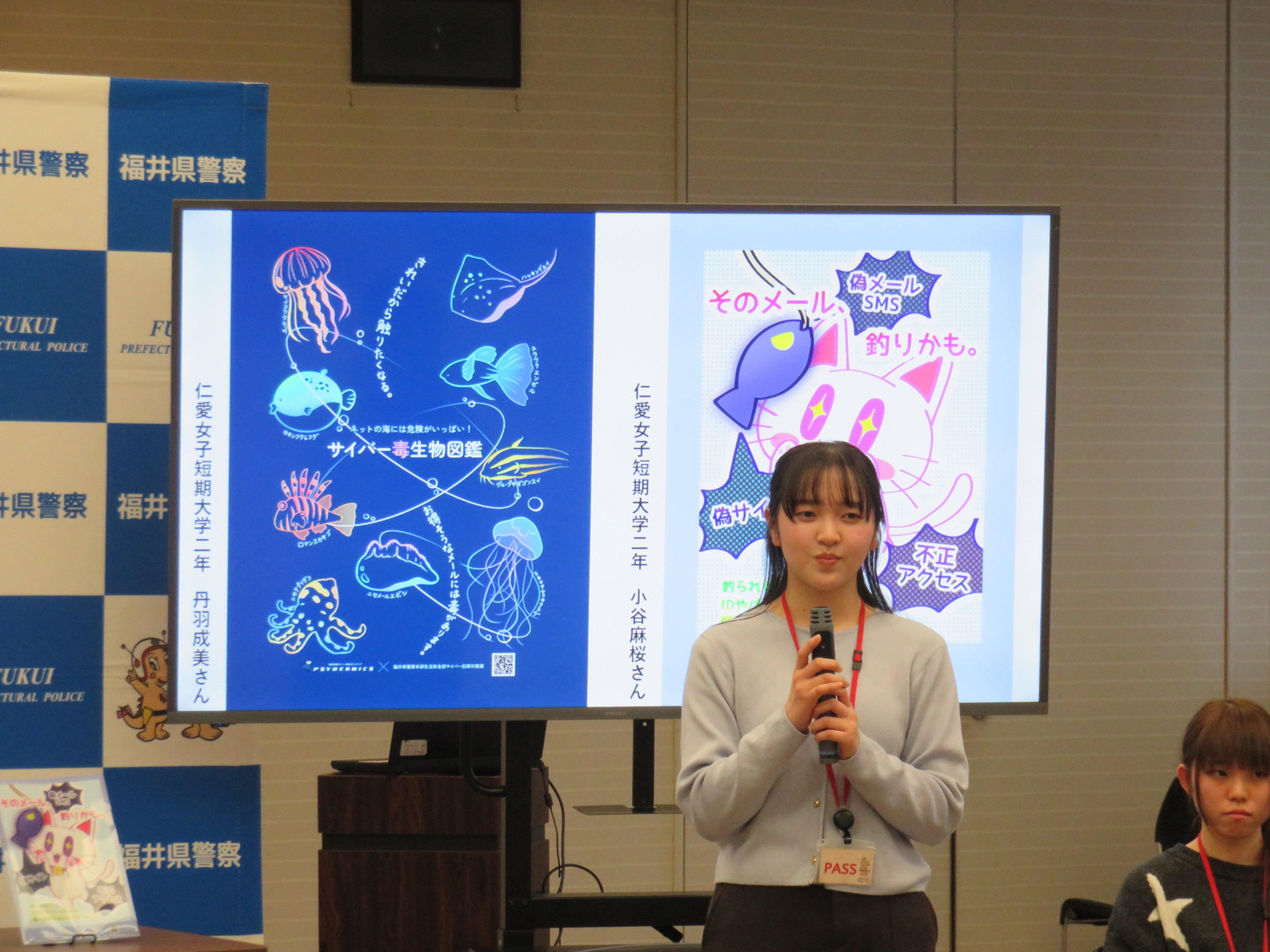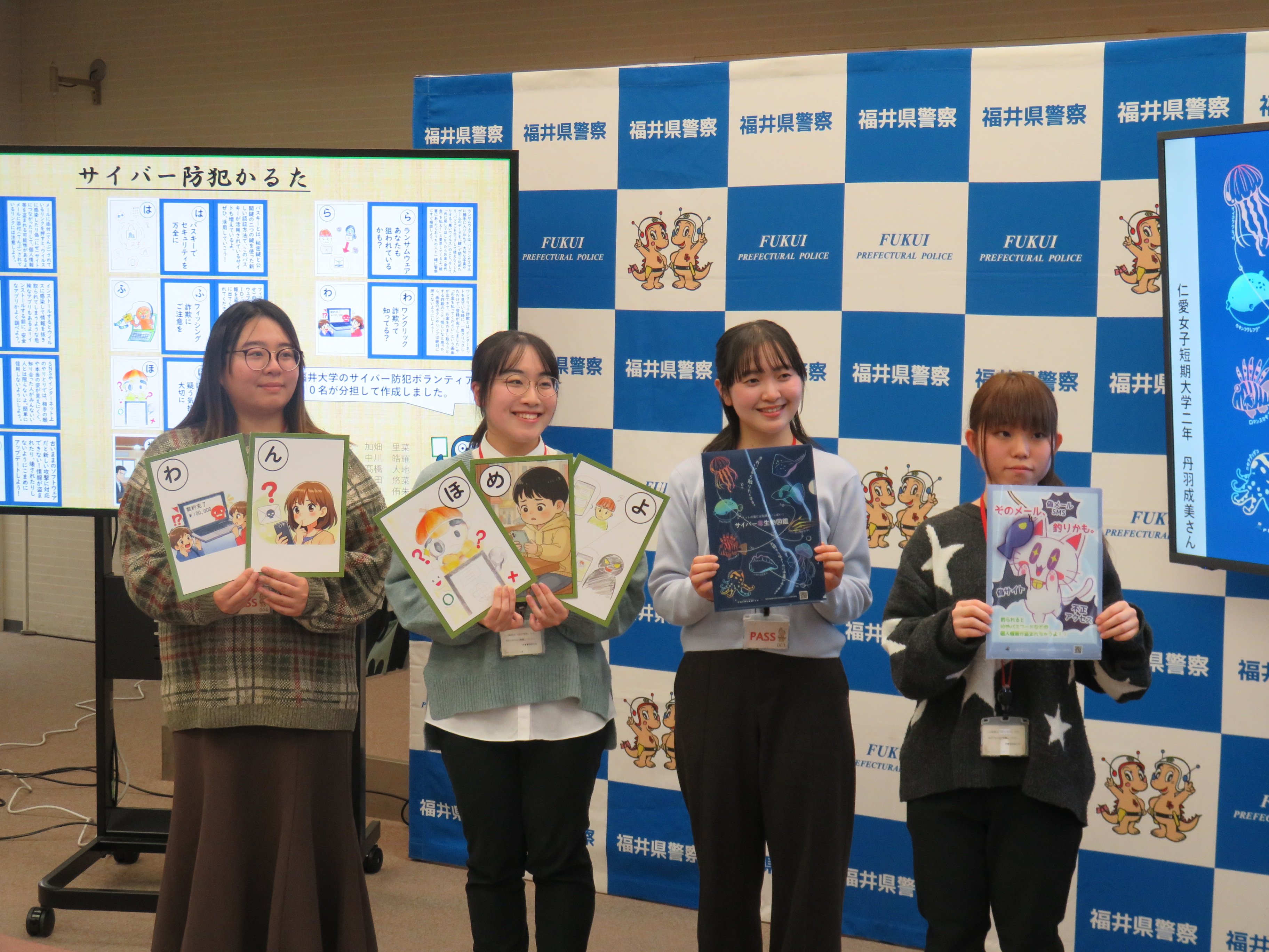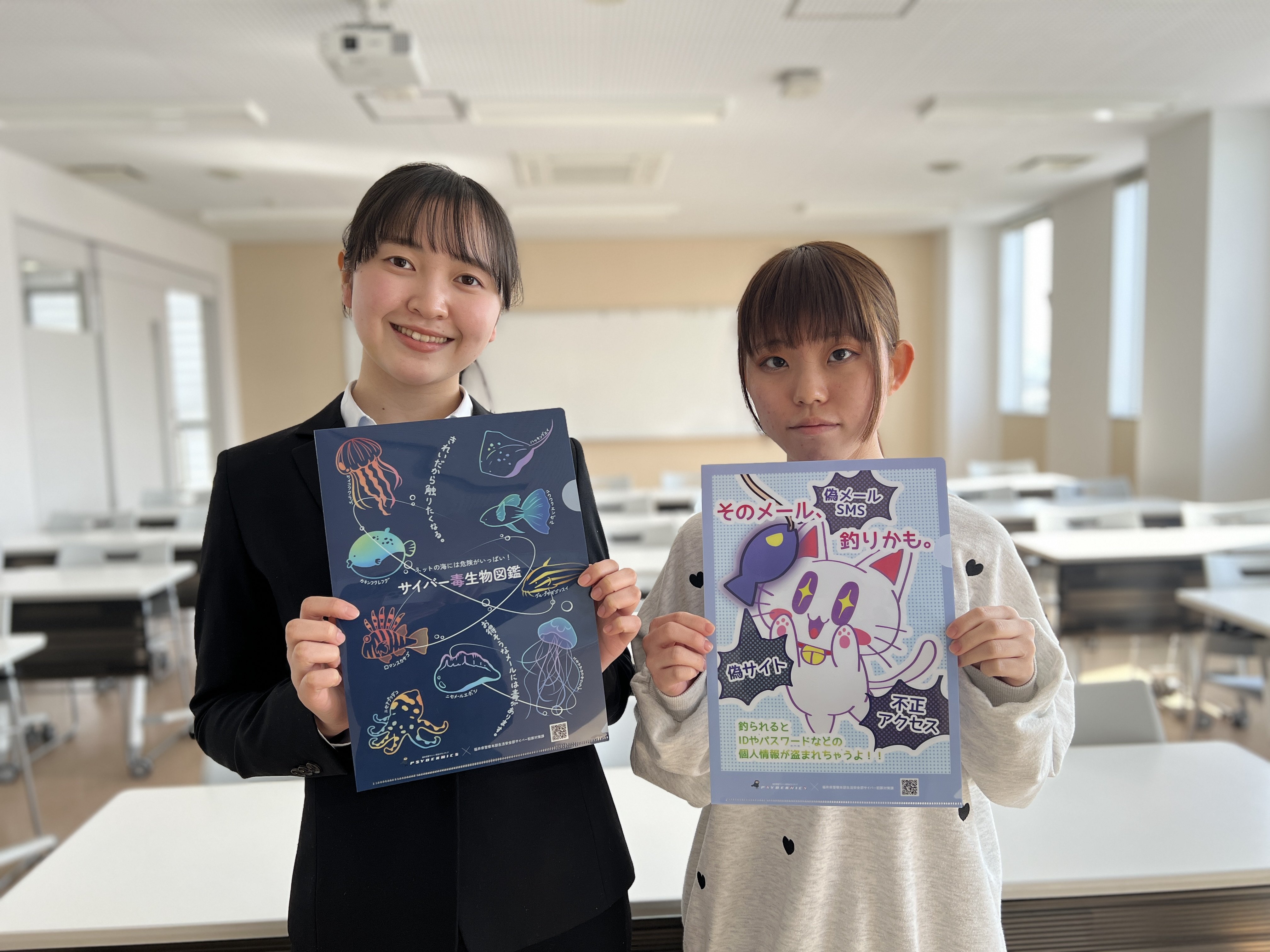 県警のサイバー防犯ボランティア「サイバニクス」に所属する生活情報デザイン専攻・吉村ゼミの学生2名が、サイバー犯罪の危険性を伝えるクリアファイルを制作しました。