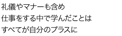 私の所属する部署は、新卒・中途などの採用をはじめ、人事に関係することが多いため、思いのほか自分で勉強しなければならないことがたくさんあります。そのため、分からないことが出てきた時は、すぐに調べたり、問い合わせをする癖をつけてきました。年数を重ねていくうちに、その癖が自然と身につき、社員の方からの問い合わせに対して、臨機応変に答えることができるようになりました。問い合わせに対してスムーズに答えることができた時や、それに対してお礼を言われた時は、この仕事をやっていてよかったと感じます。実際、会社に入社してからは、仕事以外にも礼儀やマナーを身につけることができました。礼儀やマナーは、一朝一夕で身につくものではありません。このように、仕事をしていく中で学ぶことは、自分にとってプラスになることばかりなので、毎日がとても充実しています。