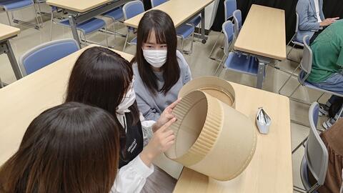 (紙でできたドラム缶をベースに新商品を考える学生たち)